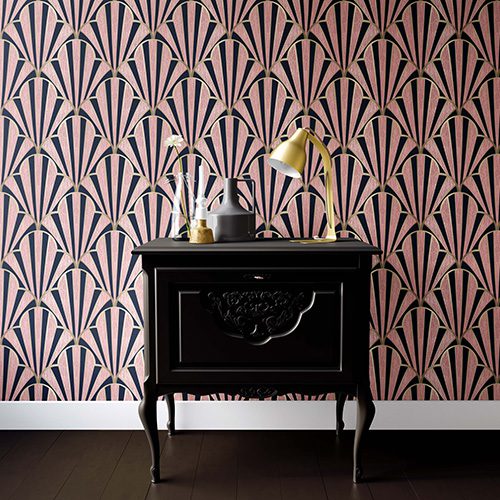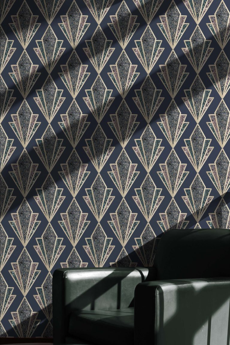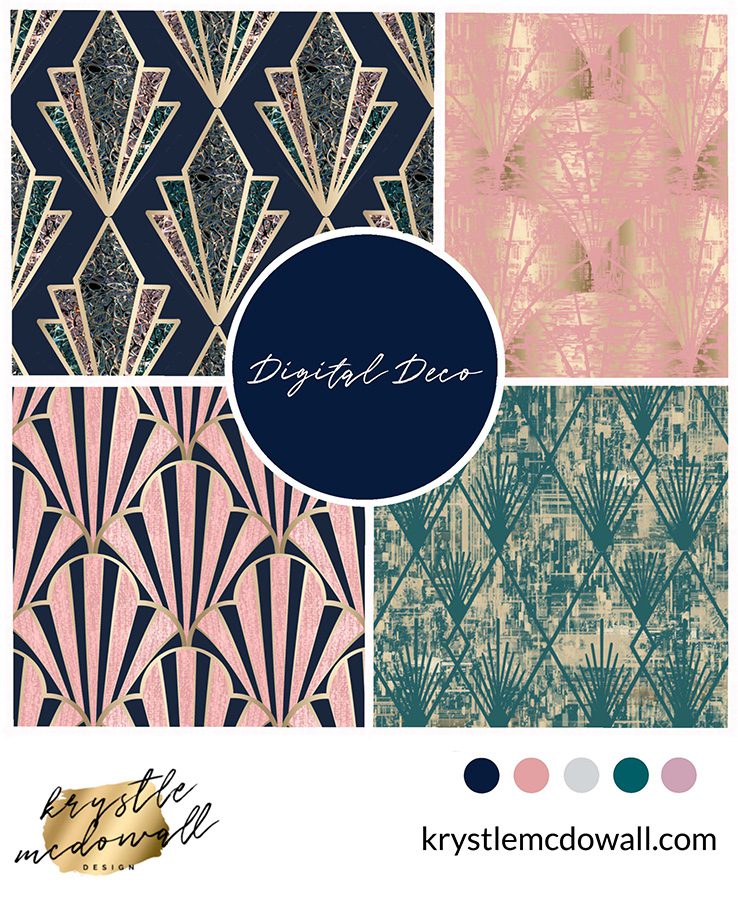From shimmering fan motifs to angular chrome-inspired elements, each pattern celebrates the luxe geometry of the Deco era while layering in unexpected textures and digital “glitches” that nod to our screen-saturated world. Soft pinks, deep navies, and metallic hues play against one another for a vibe that’s both nostalgic and future-forward.