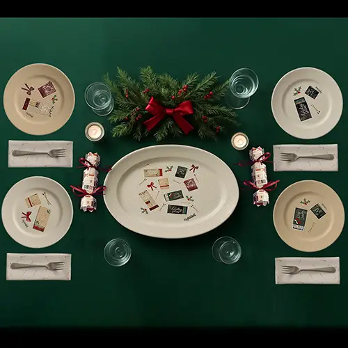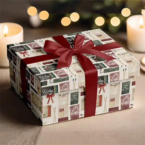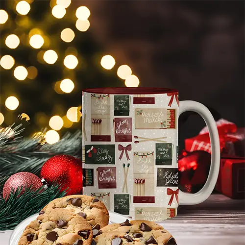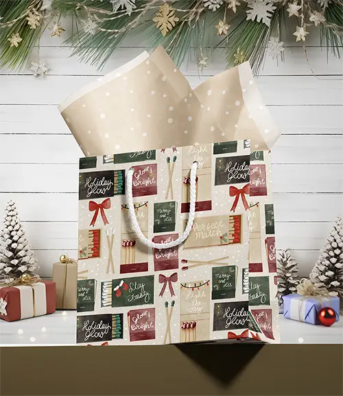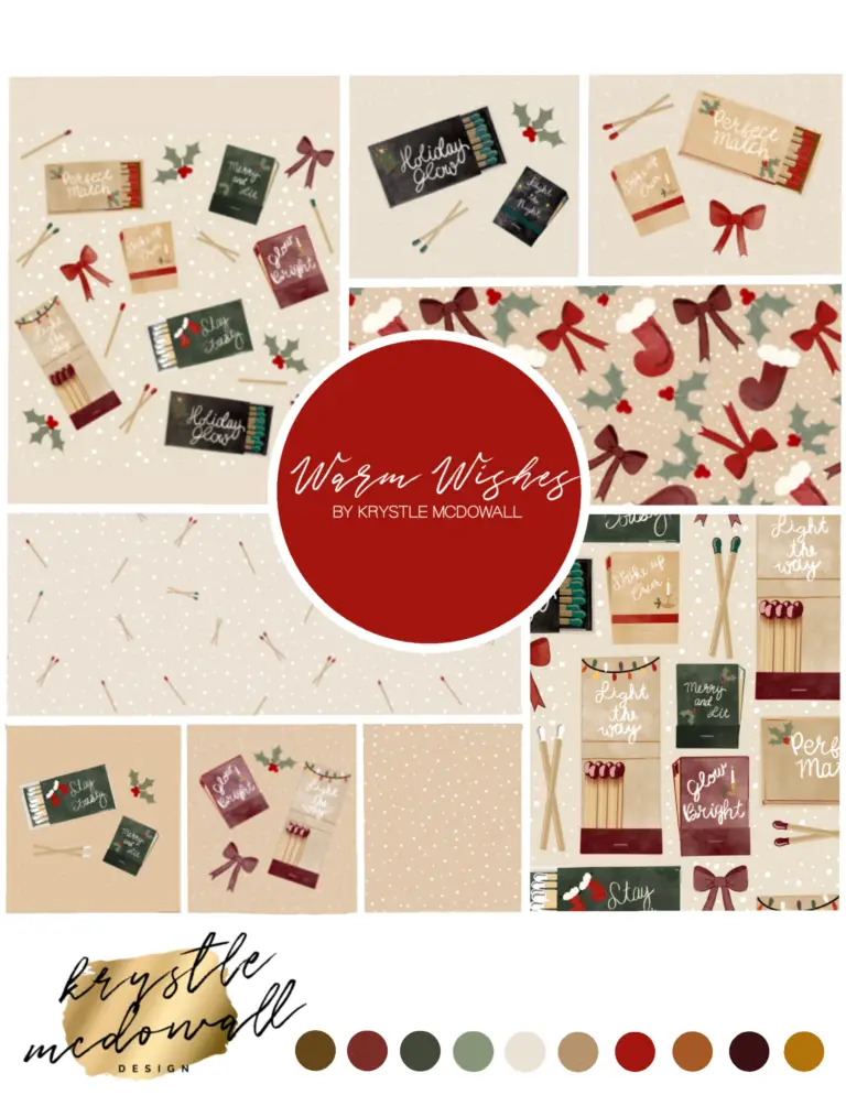 “Warm Wishes” celebrates the spark of connection — those small, glowing gestures that warm the heart. Each design is inspired by handwritten matchboxes, the kind that carry both light and sentiment. Tiny notes, thoughtful messages, and nostalgic illustrations flicker across cozy holiday tones of spiced red, evergreen, parchment, and cocoa, creating patterns that feel both handcrafted and heartfelt.