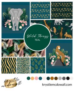 It blends hand-illustrated wildlife — elephants, leopards, giraffes, and zebras — with layered foliage, tropical blooms, and sun-soaked motifs. The color palette is anchored in deep teals and emeralds, with contrasting warm ochres, blush tones, and botanical greens, evoking twilight in the jungle.