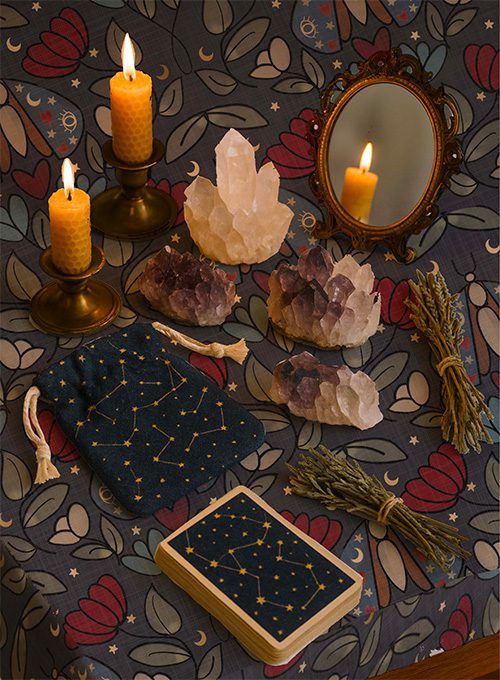 Deep in the Witching Wilds, there’s a hidden cottage wrapped in vines and mystery. The garden hums with enchanted blooms, celestial maps hang like tapestries in the sky, and everything, from the worn floorboards to the woven cloth, pulses with quiet magic. These patterns tell the story of a life lived beautifully off the beaten path… guided by nature, nurtured by ritual, and forever connected to the cosmos.